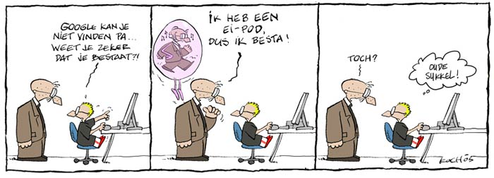 'Dijkman' (2006). Translation: "Google can't find you, dad. Are you sure you exist?!" Dad: "I have an egg-pod, so I exist. Don't I?"  Son: "Old idiot!"  (The cartoon is a pun on the word "ei" ("egg") and the similar sounding word "i" in iPod.