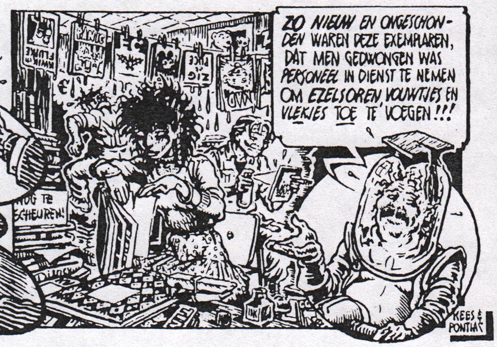 Between 1982 and 1984 Yendor published a comic magazine called Rhaa Lovely, which contained translated comics from the French magazine Fluide Glacial by Gotlib. Each issue had a page with advertisements for Dutch comics shops. Lambiek usually supplied a strip which either spoofed the concept of comics shops or addressed why Lambiek had no advertisement on the page. The first two strips were made by Frits Jonker and Peter Pontiac, based on ideas by Kousemaker, but in the fourth issue in 1982 none other than Plukkie made a promotional comic for Lambiek. The strip was later also included in 'Lambiek's Almanak 1968-1993', an overview book compiled on the occasion of the shop's 25th anniversary in 1993. Simone Koch remained associated with Lambiek until about the early 1990s.