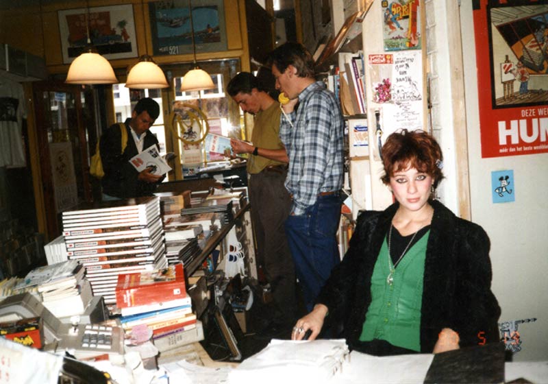 Simone in Lambiek around 1984. Klaas Knol is on the phone in the back.