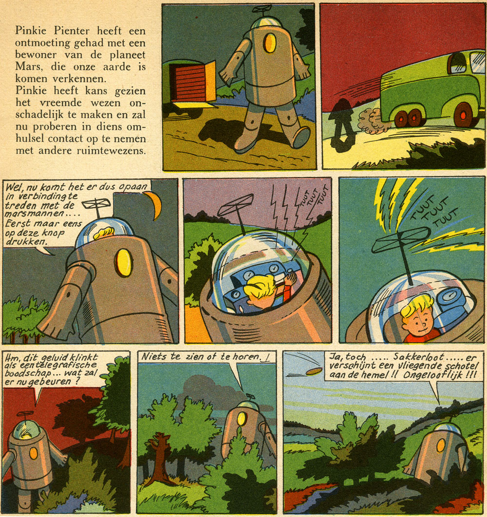 Just like 'Tintin', the 'Pinkie Pienter' comics make use of science fiction and mystery. But while 'Tintin' is set in a plausible reality, 'Pinkie Pienter' is pure fantasy. Robots, UFOs, Martian & Saturnian invaders, treasure hunts, deserted islands, hungry cannibals, dinosaurs, Atlantis, time machines, submarines, the Emperor of China, Neptune... are all recurring ingredients. Given that his nephews were the target audience, it can be argued that Koeleman deliberately kept the stories simple and näive. Yet even then, many stories are filled with continuity errors. In the first story, 'De Grote Wedstrijd' ('The Great Race') Pinkie meets Floris Fiedel, who a few panels later is suddenly named "Flores" (with an "e" instead of an "i"). Koeleman keeps misspelling the name up until the fourth story, 'De Geheimzinnige Verdwijning in Atoomstad', after which he seems to have realized his mistake and Flores is named Floris again. A more glaring continuity error is Pinkie's dog who suddenly disappears halfway through 'De Grote Wedstrijd' without a proper explanation, never to return again in the series. Not even Pinkie notices his pet is gone. On the cover of 'Mannen van Mars Landen op Aarde', the Martian leader Plastico walks around as a giant creature, but in the story itself no such scene takes place. In fact, quite the opposite happens: Floris is shrunk by Plastico to become as small as him. Other notable inconsistencies can be found in Pinkie himself. On every album cover he has normal round eyes, but in the stories themselves he has dotted eyes. The background colors in the series also have a tendency to change in between panels.