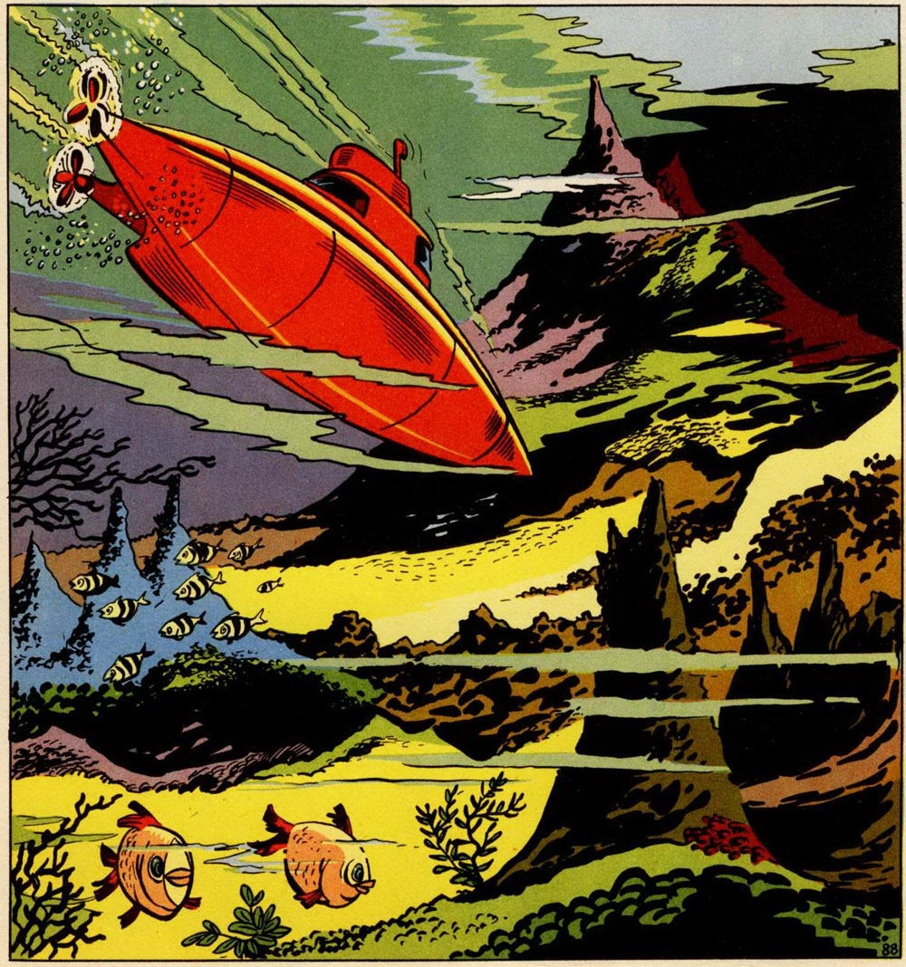 In many 'Pinkie Pienter' stories, poses were directly traced from Hergé's 'Tintin' stories, the most noticeable examples lifted from 'The Crab With The Golden Claws', 'The Secret of the Unicorn', 'Tintin in the Land of Black Gold' and especially 'The Calculus Affair'. Although it must be said that this occurred more often in stories made by Koeleman's successors. In 'De Tijdmachine', a few scenes involving pirates were directly copied from 'The Secret of the Unicorn', while in another story Pinkie travels to Mars in a red-and-white checkered moon rocket, similar to 'Explorers on the Moon'. Koeleman must have read Jules Verne a lot too. The albums 'De Strijd om Raket PX 15', 'Spionnen in de Ruimte', '20.000 Mijlen Onder Zee' and 'De Andere Wereld' obviously borrow a lot from 'Voyage to the Moon', '20,000 Leagues Under the Sea' and 'Voyage to the Center of the Earth'.