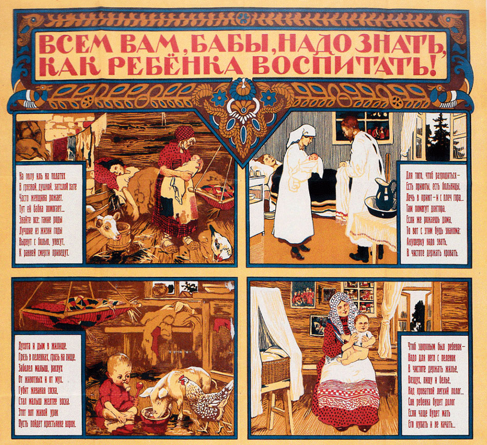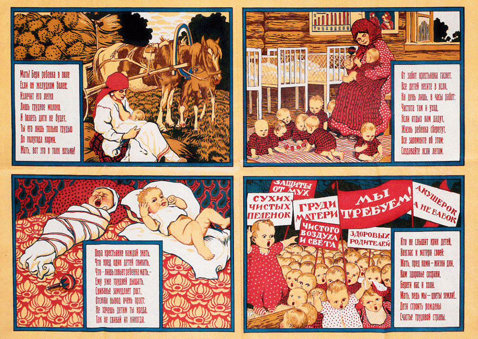 In Komarov's comic strip, the bad, old-fashioned way of raising children is shown in the left column, while the good, modern way is demonstrated at the right. Left we see a mother raising her new-born in a poor, unclean house, full of barnyard animals. In this environment her future offspring will just grow up without hope for improvement. By contrast, we see a mother at the right in a hygienic bedroom, safe in the comfort of a proper doctor and nurse. Her child grows up in a clean environment and, as an adult, will bring more healthy babies into this world. The final panel suggests that these children will become model citizens who'll change the world for the better. Or, better said, new supporters of the Soviet regime. This watercolor cartoon is nowadays part of the Tate Gallery collection.