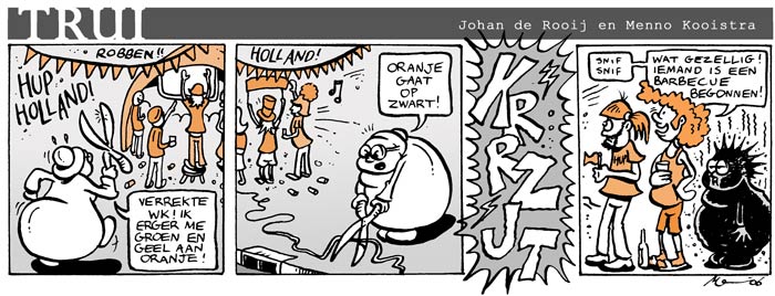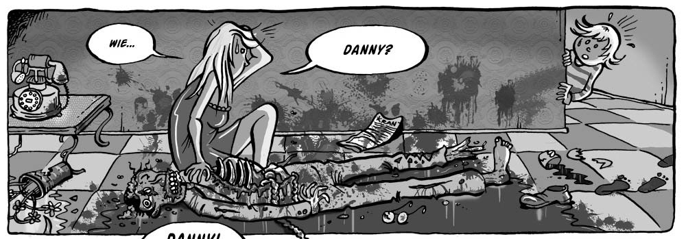 Born in 1976, Menno Kooistra was raised in the north of The Netherlands, developing a keen passion for both comics and genre movies. As a teenager, he published his first monthly magazine containing work by himself and a friend. In 1993, he released Sédox, a comic fanzine with morbid alternative comics by different artists. Later that decade, he published comic stories with characters like Prins Dolalorus, Scot Scrotum and Wubbe Wind in the Groningen amateur comic magazines De Stripper, edited by Sven van der Hart, and Impuls, edited by Reinder Dijkhuis and Kilian Hekhuis. Kooistra has mentioned Peter Pontiac, Robert Crumb and Hanco Kolk as important graphic influences. In 1996, Kooistra moved to Amsterdam to study at the Netherlands Film Academy, followed between 1998 and 2003 by an education in Film and TV Sciences at the University of Amsterdam.