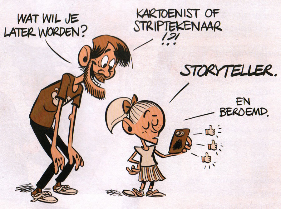 Alex van Koten drawn by Michiel Offerman in a cartoon accompanying his column in Stripglossy #15 (2019). Translation: "What do you wanna be when you grow up: cartoonist or comics artist?" - "Storyteller and famous."