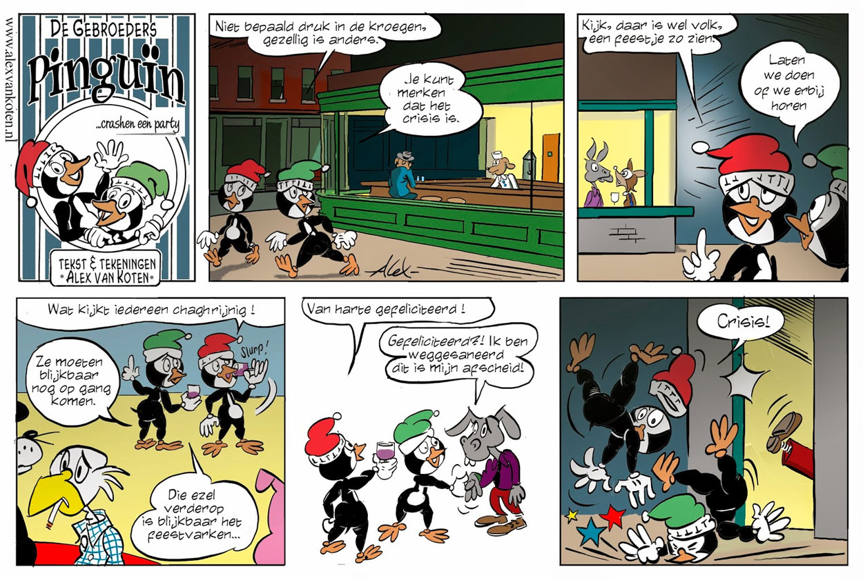 Alex van Koten's longest-running comic is 'De Gebroeders Pinguïn' (2008-   ), a funny animal feature about two intractable penguins. It has appeared monthly in Straatjournaal, the street newspaper from the North Holland region. In his strips, the cartoonist often winks at other pop culture phenomena. In one episode he for instance based a street scene on the Edward Hopper painting 'NightHawks', and introduced a more vulgar version (with different colors) of Walt Disney's 'Jose Carioca' in another strip. Initially a monthly half-page in black-and-white, the strip has appeared in color since 2013 and on a full page since 2016.