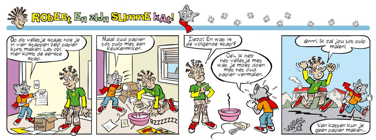 'Robert en Zijn Slimme Kat'. The cat explains how one can make paper in four simple steps, but accidentally grinds the instruction file into the kitchen mixer.