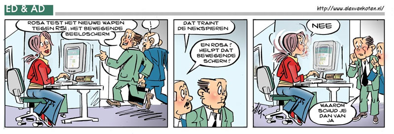 'Ed & Ad'. Translation: "Rosa is testing the new weapon against repetitive strain injury: the moving screen. It trains the neck muscles." - "And Rosa? Does the moving screen help?" - "No." - "Why do you nod 'yes', then?".