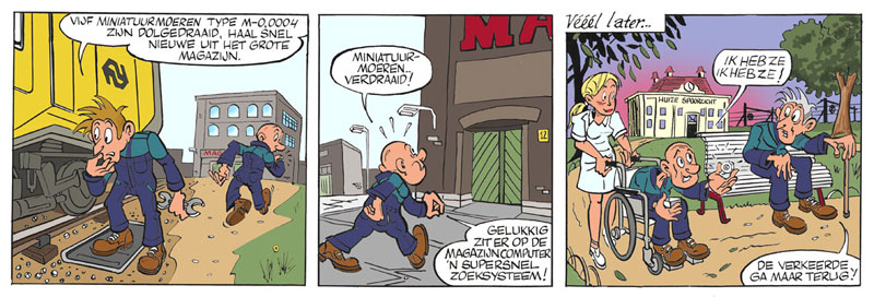 'Stoffer & Blik'. - Translation: "Five miniature bolts type M-0004 have torn and broken. Quick: get some new ones from the big warehouse." - "Miniature bolts, for heaven's sake. Luckily, the warehouse computer has a superfast search engine." - "Much later..." - "I got them! I got them!" - "The wrong ones: go back already."