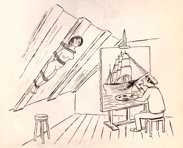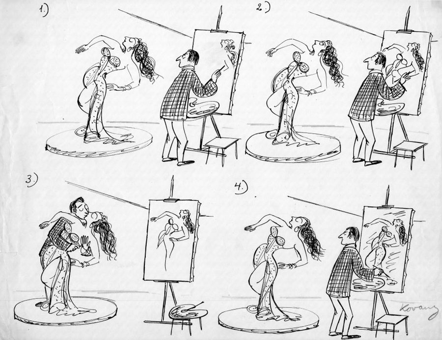 Although Kovarsky drew about a wide variety of topics, art is his signature theme. Many of his cartoons depict painters, sculptors, photographers, models, museums, curators, critics and museum visitors. Sometimes he directly referred to well-known artworks, such as Hokusai's 'The Great Wave off Kanagawa' and Auguste Rodin's 'The Thinker'. Another favorite topic was Greek-Roman mythology. His daughter recalled that her father had a keen interest in mythological scenes on ancient vases and in baroque paintings. He also felt a kinship with the artist André Dubout, who modernized Greek myths in his work. In his own work, Kovarsky even mimicked the facial profiles and stylized imagery from ancient Greek art.