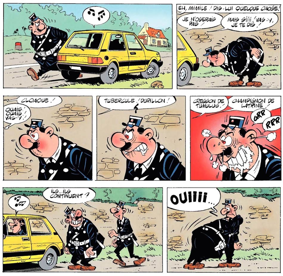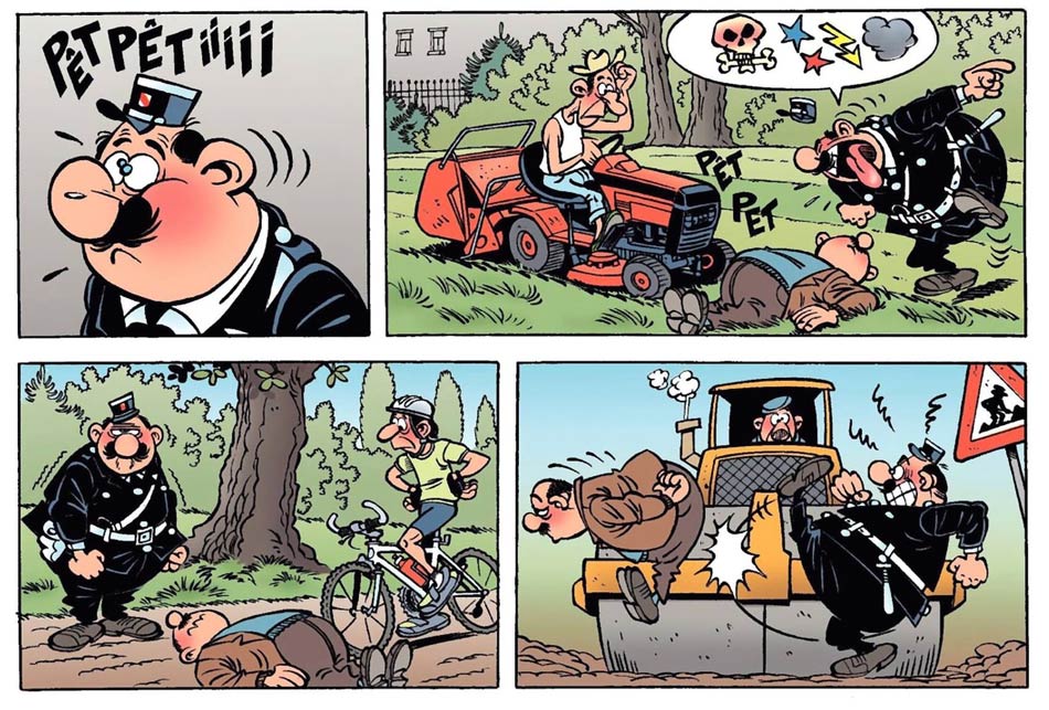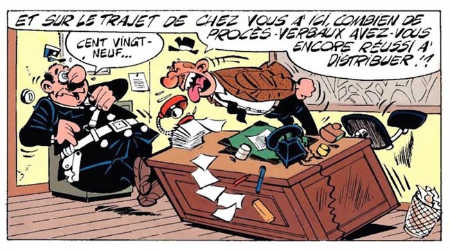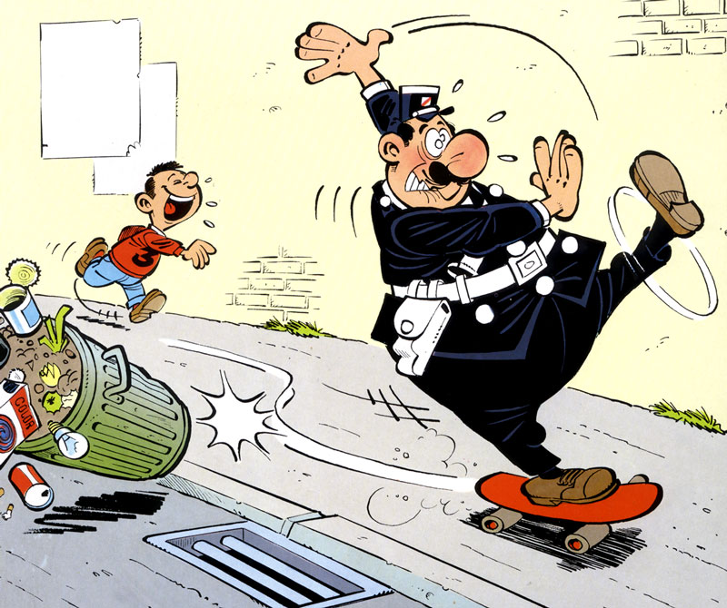 Agent 212 - real name Arthur Delfouille - is utterly bad at his job. Basically a manchild, the policeman misinterprets situations, leading to funny misunderstandings and mayhem. Whenever faced with a problem, he either uses the wrong methods or has no clue what to do about it. When confronted with danger, he scares easily and rarely has anything under control. And instead of staying calm in stressful situations, Agent 212 often loses his temper, literally foaming at his mouth. Although depicted as a twit, readers still feel sympathy for 212's misfortune. In the end, he means well, but lacks the brains and skills to be a model policeman. After all his blunders, the hot-tempered police commissioner Raoul Lebrun is utterly frustrated with his subordinate and never gives him a break. If something seems fishy, he instantly assumes the clumsy cop messed up again. In certain gags and short stories, however, Agent 212's misfortune isn't his fault at all. Annoying neighborhood children, disobedient civilians, reckless traffic offenders and obnoxious drunks frequently test his patience and goodwill. On these occasions, it actually feels satisfying whenever he manages to win the day, even when he abuses his authority to get things his way.