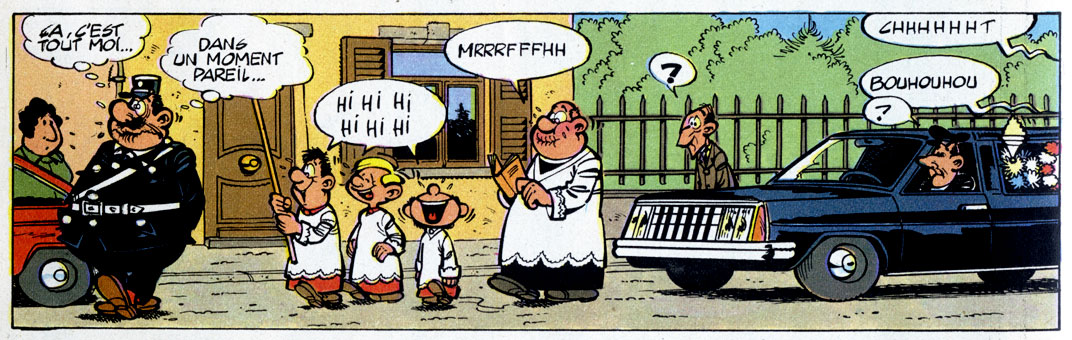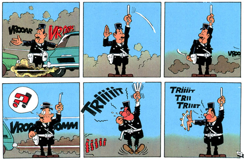 Incompetent policemen had been a notable source of comedy in Belgian comics before. Prime examples being Agent 15 in Hergé's 'Quick & Flupke', Agent Tieter in Willy Vandersteen's 'De Vrolijke Bengels', the "Champetter " in Marc Sleen's 'De Lustige Kapoentjes' and Longtarin in André Franquin's 'Gaston Lagaffe'. Still, all these stupid or mean guardians of law and justice were always secondary characters, serving as comic relief or foils. In Cauvin and Kox's story, the policeman was the protagonist. Initially modeled after Franquin's Longtarin character, the original Agent 212 was still slender. As the episodes progressed, Kox made the character more corpulent, giving him a natural dopey and laughable look, comparable to Oliver Hardy. When asked why he chose the number "212", Cauvin explained it was simply the first number that came to his mind.