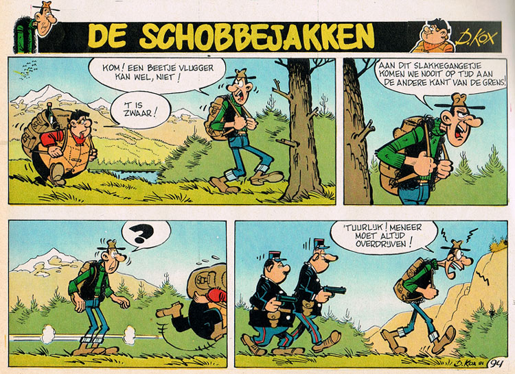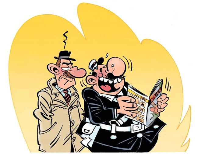 Between 1978 and 1981, Spirou also ran Daniel Kox's earlier concept, the gag strip 'Les Indésirables'. When Kox joined Spirou in 1974, the strip was rejected by editor-in-chief Thierry Martens - but his successor Alain De Kuyssche even preferred it over 'L'Agent 212' and had the two series run simultaneously. Debuting in Spirou issue #2112 (5 October 1978), the strips were generally printed on half a page, with two strips per episode. In a sense, 'Les Indésirables' was a mirror companion to 'L'Agent 212'. Instead of a stupid and incompetent policeman, it deals with two dumb and worthless criminals. The nameless scoundrels try to kidnap, smuggle or steal, but always fail miserably. Like the title implies, they are therefore "indésirable" ("unwanted"). The chief is tall, while his crony is short-sized. The two crooks usually get caught because the short one says or does something incredibly stupid. As a running gag, the final panel always shows them in jail, where the chief pounds on his sidekick because of his stupidity. 'Les Indésirables' ran irregularly for four years, with the final episode appearing in issue #2298 (29 April 1982). In Dutch, the series appeared under the title 'De Schobbejakken'. Because he couldn't combine it with the far more successful 'L'Agent 212', Kox eventually discontinued 'Les Indésirables'. In a special "comeback special" of Spirou magazine - issue 3839 of 9 November 2011 - the two clumsy crooks briefly returned.