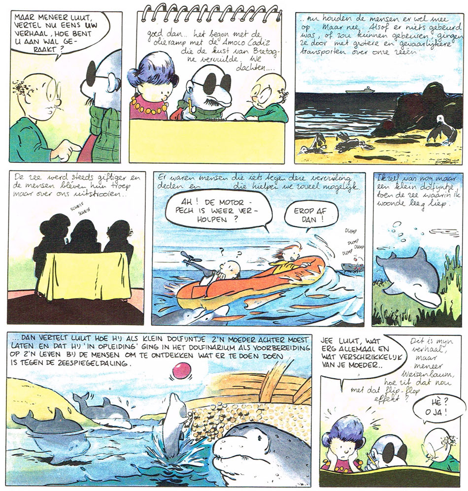 Around 1988, Van der Kraan began collaborating with his wife Joop Reichenfeld, initially on ecologically themed comics. By commission of the environmental movement Aktie Strohalm, they created 'Het Flip Flop Effekt' (1988), a comic book about climate change, scripted by Van Arkel. For the environmental center De Grote Rivieren, they made the comic booklet 'Joep Voelt Nattigheid' (1988), about the state of the Dutch rivers. In addition, Van der Kraan produced cartoons for several environmental magazines. Since its start in 1988, Van der Kraan has been the regular cartoonist for Bliksum, the magazine of Stichting Delftse Natuurwacht (the Delft Nature Watch Foundation). His recurring characters in this magazine are Jasper and Jorien, who also starred in the self-published comic booklet 'De Bunker' (1988), in which the two youngsters campaign against the demolition of an old bunker that houses a bat population.