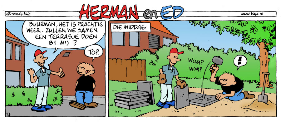 'Herman en Ed'. Translation: "Neighbor, it's beautiful weather. Shall we have a drink on the terrace at my place?" - "Top!" - "That afternoon...".