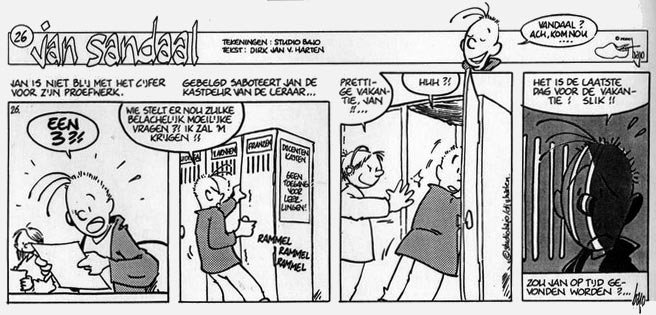 In addition to 'Jaspern en Jorien' in Bliksum, Van der Kraan has created several other comic features with a certain durability. In 1990, Studio Bajo was approached by the municipality of Woerden for a series of 26 gag strips dealing with vandalism. This resulted in the comic strip 'Jan Sandaal', about a recalcitrant yet endearing teenager. After having the initial gags printed in Woerdense courant, the feature was picked up by the weekly youth section of the regional newspaper Brabants Dagblad. When in the mid-1990s that section merged with the youth section of the Tilburg newspaper, 'Jan Sandaal' transferred to Maas & Noordkroniek, one of the neighborhood newspapers in Den Bosch. The early gags were written in collaboration with Dirk Jan van Harten.