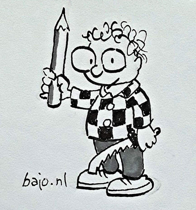 In January 1989, Van der Kraan and Reichenfeld officially grouped their commercial art activities under the banner Studio Bajo. Initially based in Geldermalsen, but quickly relocated to Den Bosch, the studio has provided illustrations, cartoons and comic strips for a variety of clients, including specialized magazines and residents' magazines for housing corporations. Besides creation, Studio Bajo has provided additional services like graphic design for commercial publications and comic lettering (for the Belgian publisher Geknipt Papier). In addition, Van der Kraan has been for hire as a caricaturist, live cartoonist, and host of comic workshops. Over the years, Studio Bajo organized several comics contests and courses, establishing a prominent spot in the cultural scene in the province of North Brabant.