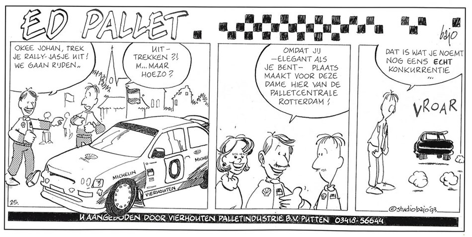 'Ed Pallet' (Start '84 #11, 1993). Translation: "O.K., Johan, pull out your rally jacket! We're going to take a ride." - "Pull out?! B-but what do you mean?" - "Because you, gallant as you are, will make room for this lady here from the pallet plant in Rotterdam." - "That is what one calls TRUE rivalry."
