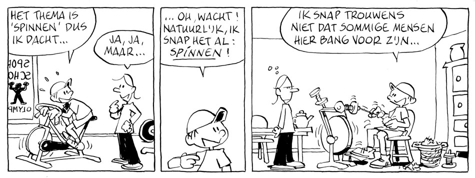 'Jasper en Jorien' (Bliksum, 2017). A pun-based misunderstanding about "spiders" and the verb "to spin" (both "spinnen" in Dutch).