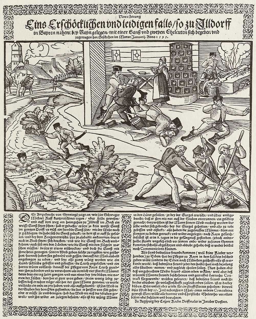 In 1595, Krebs produced another notable report about a real-life murder, this time in the town Illdorf. In January of that year, a man named Michael Ruff murdered another man and then his own wife. Afterwards, he ran away and fell into a river. His crime was discovered and local villagers lynched him. Much like his earlier Neuberg murder print, Krebs visualizes all events in one panel, with a description in rhyme printed underneath the images. But the events are a bit easier to follow. The story starts off in the upper right corner, where Ruff and his wife are cooking food. In the upper center, Ruff strangles a man with his wife standing nearby. He kills her afterwards, pushing her to the ground, as depicted in the center of the panel. To the center right, Ruff looks back at his crimes in the previous sequences, horrified over what he has done. The narrative continues in the lower left corner, where Ruff chases a goose, tries to capture it, but falls into the river instead. In the right lower corner, villagers lynch him.