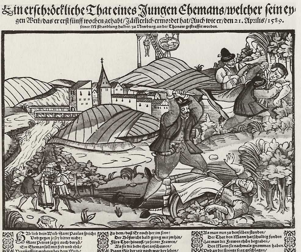 In 1589, Krebs printed a graphic news report about a murder in Neuburg an der Donau: 'Mord bei Neuberg an der Donau'. On 21 April 1589, two men robbed a woman in the local forest. They beat her to death and hung her corpse in a tree. The murderers were arrested, convicted and executed. They were tortured on the wheel and hung at the gallows. All these events are visualized in one panel, with a rhyming text describing the murder and its aftermath. Krebs shows one criminal beating the woman with a stick on the foreground. These two are drawn far larger than all other events, to serve as an eye-catcher. In the right upper corner, he and his accomplice put a rope around the battered corpse and hang her in the left lower corner. The execution of the criminals is shown in the upper center of the illustration. For a modern-day audience, the story is visualized in a very confusing manner. The sequences are crammed together and don't follow a logical reading order.
