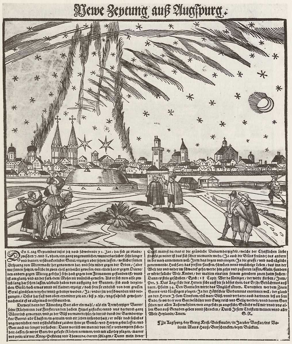 Georg Kress depicted several news events of his time. In 'Erscheinung am Himmel über Augsburg' (1591) he visualized a strange sky phenomenon observed above the town Augsburg on 8 September 1591. A similar event, seen on 17 April 1621, was visualized in 'Erscheinung am Himmel über Augsburg am 17 April 1621' (1621). An unexplained religious vision in an abandoned church in Plan, Bohemia, which occurred on 24 July 1614, also took his interest. He depicted it in 'Erscheinung in einer verlassenen Kirche in Plan (Böhmen) am 24 Juli 1614'. Kress additionally reported more common tragedies, such as a city fire in Augsburg on 21 January 1620 ('Feuersbrunst in Augsburg am 21 Januar 1620'). The artist also had attention for more positive events. He glorified the coronation of emperor Matthias II of the Holy Roman Empire ('Krönung des Kaisers Matthias II am 24 Juni 1612') and the royal visit of Gustav Adolf II of Sweden to Augsburg ('Der Einzug Königs Gustav Adolf von Schweden in Augsburg am 14 und 24 April 1632').
