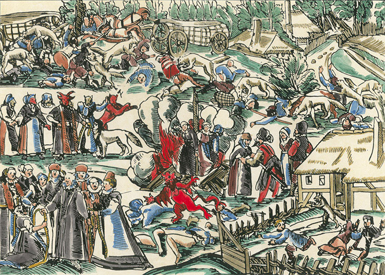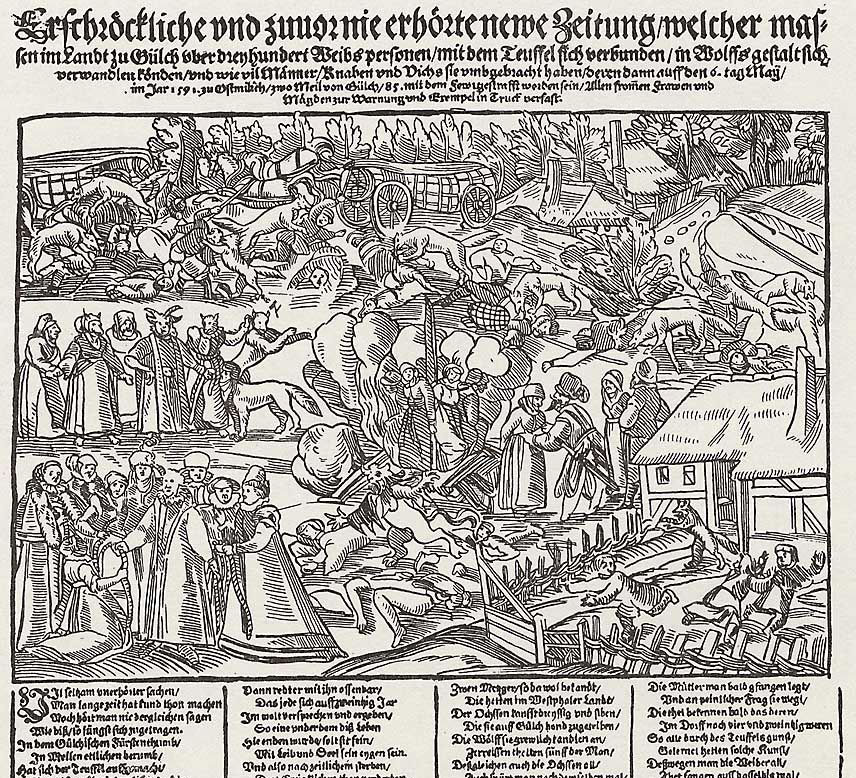 In 'Nachricht von 300 Hexen und ihrem Pakt mit dem Teufel' ("Report about 300 Witches and their Pact with the Devil", 1591), Kress visualizes a mass burning of 300 women accused of witchcraft in the German town Jülich, on 6 May 1591. The narrative should be read clockwise, starting with the scene depicted in the left lower corner, where the Devil summons various women. In the scene above, the Prince of Darkness gives the witches the power to change themselves into werewolves. The next scenes show how the witches/werewolves create havoc in the countryside. They spare nobody, not even children. In the center image, the possessed women are burned at the stake.