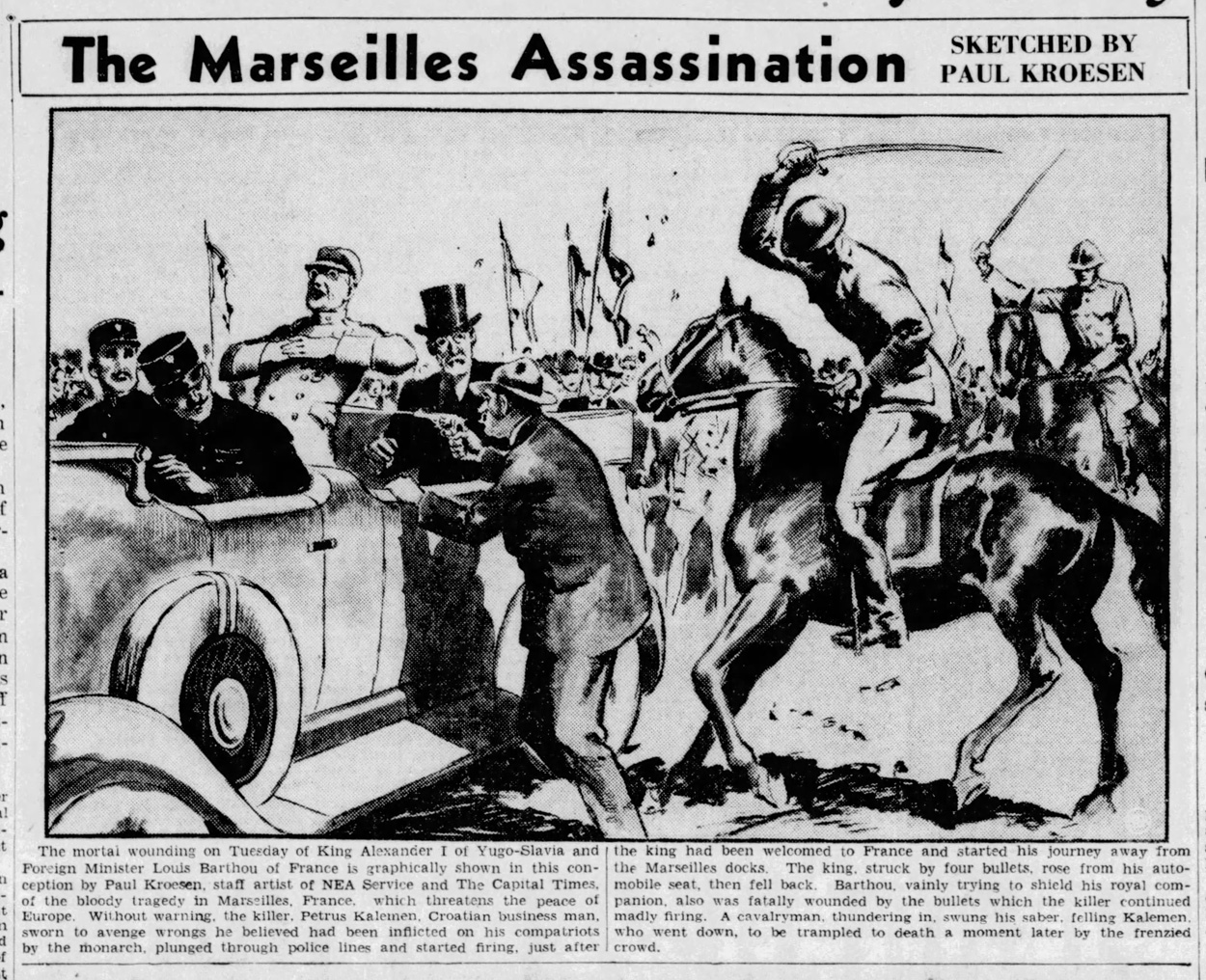 News illustration covering the assassination of King Alexander I of Yugoslavia in Marseille (The Capital Times, 10 October 1934).