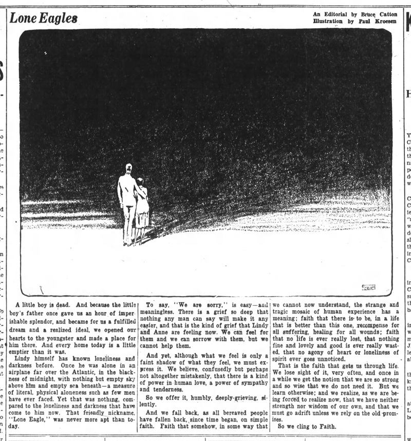 At the NEA, Kroesen was mainly active as a news sketch artist, often illustrating the editorials by Bruce Catton. He notably covered the kidnapping of the baby of aviator Charles Lindbergh, which dominated the headlines during most of the 1932-1935 period. Kroesen not only illustrated the latest news on the tragic event, but also captured its sentiments and suspense. One of his drawings of the Lindbergh baby earned Kroesen a Pulitzer Prize nomination. Following the arrest of the alleged kidnapper Bruno Hauptmann, Kroesen envisioned the expressions of both Lindbergh and the accused, when they would first face each other during the so-called "Trial of the Century". It was printed in the newspapers on 27 September 1934.