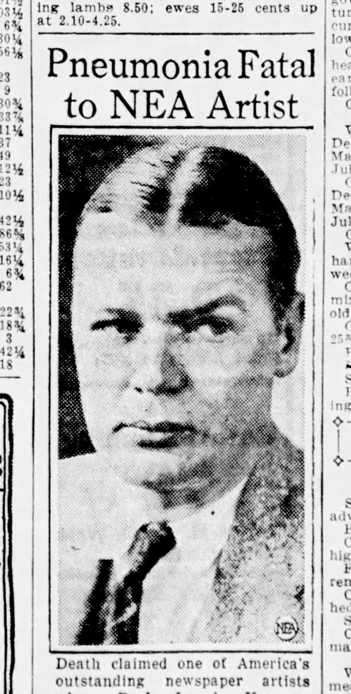 Paul Kroesen was noted for his many religious drawings, including a 1935 rendition of Leonardo Da Vinci's Last Supper commissioned by the Diocese of Cleveland for the Eucharistic Congress. The artist was only 34, when he passed away from bronchial pneumonia on 15 October 1935. His obituary issued by the NEA called him "one of America's outstanding newspaper artists", whose "superb illustrations for the last decade have graced thousands of feature stories in papers throughout the United States".