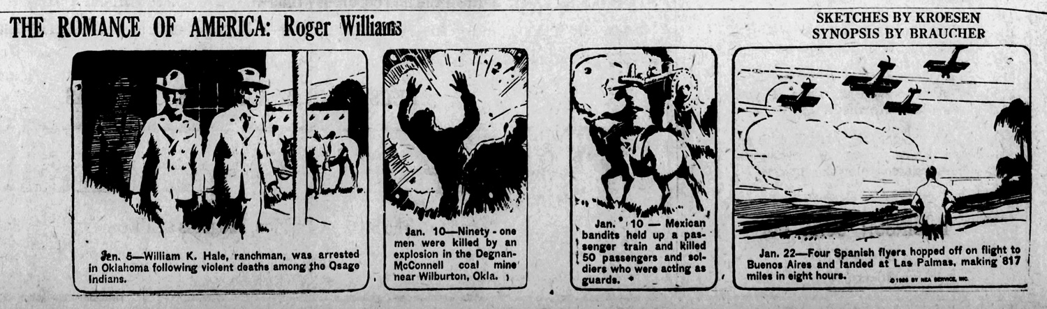In addition, Kroesen provided illustrations to the NEA's fiction serials, such as 'Jungle Breath' by Lucien Burman in 1927 and 'Sunrise of the Wheat' by James Stevens in 1935. He was assigned to draw installments in the syndicate's educational comic feature 'The Romance of America', a series of biographical picture stories about important persons from U.S. history, written by Bill Brauch. Kroesen illustrated the lives of Sam Houston (28 October-18 November 1926), Roger Williams (19 November-9 December 1926), Andrew Jackson (18-30 April 1927), John Jacob Astor (2-11 May 1927) and P.T. Barnum (12 May-7 June 1927). Kroesen also drew the interlude episodes 'The Life of Christ' by Dr. William E. Gilroy (2 March - 16 April 1927) and 'The Picture Story of 1926' (10-31 December 1926). Other illustrators for 'The Romance of America' were Larry Redner, Loron Taylor and Phil V. Bessey.