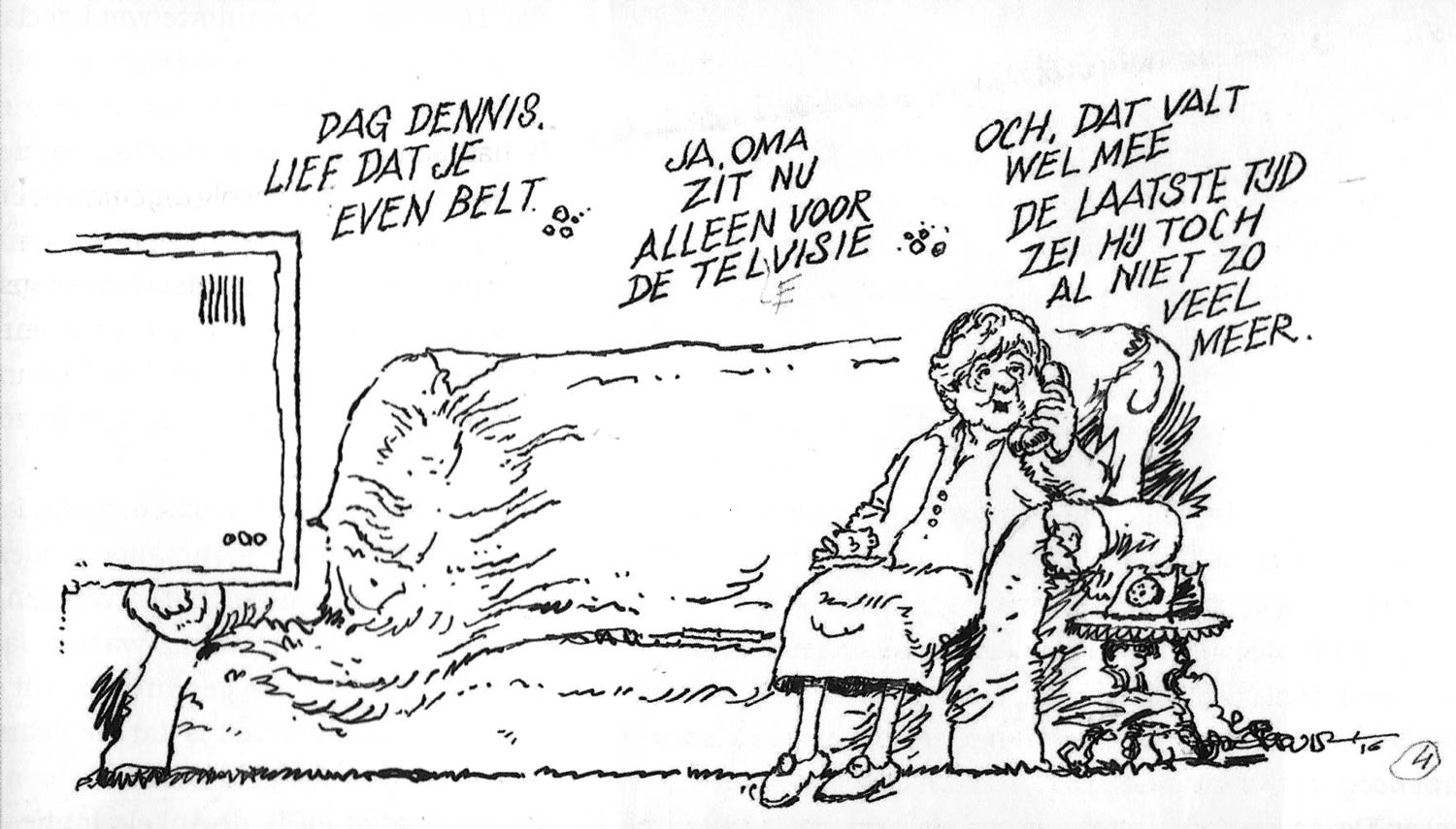 2016 cartoon by Jan Kruis, in which he reflected on his upcoming death. "Hello Dennis, sweet of you to call." "Yes, grandma is watching television, alone." "Ow, it's fine. In the end he didn't say that much anyway."