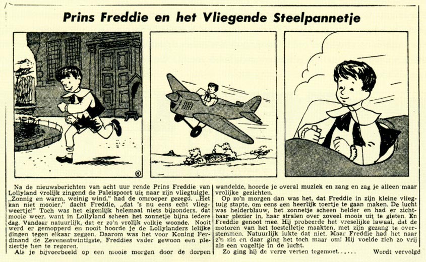 Johannes Andries Kruis was born in 1930 in a working class area of Rotterdam. His father was initially a carpenter, but later worked as a porter in the Rotterdam harbors. During World War II, Kruis grew up in the heavily bombed harbor city. As a result, most of his childhood drawings depicted battles, weapons and airplanes while the young cartoonist also made his own papers. As a youngster, he was introduced to the world of professional drawing after receiving tips and tricks from fellow Rotterdam artist Wim Meuldijk, the creator of 'Sneeuwvlok de Eskimo' in Voorwaarts magazine. Another inspiration was Marten Toonder's 'Tom Poes' comic. Toonder's creation was a major influence on Kruis' first comic, 'Prins Freddie', which he sold to a printing company in Dordrecht. This text comic, with text captions beneath the images, centered on the adventures of a young prince. However, the planned booklet was never published.