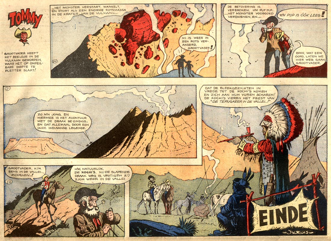 Starting in 1958, Kruis spent seven years as a commercial artist with the The Hague office of the advertising firm Van Maanen, doing mainly advertising and illustration assignments for petrol company Shell and the Niemeijer tobacco factory. During this period, he developed his recognizable cartoony drawing style, with its loose lay-outs and shaky ink lines. Between 1958 and 1963, Kruis was assigned to contribute to the Shell Junior Club magazine Olidin, produced by Van Maanen. These first professional efforts as a comic artist included creations like the young cowboy 'Tommy' (five stories, 1958-1963) and the medieval minstrel 'Baldino' (two stories, 1959, 1963). In later years, Kruis revealed that he had no particular knowledge of the Far West or the Middle Ages, but just improvised as he went along. For the second 'Baldino' story, Kruis outsourced the artwork to Jan van der Voo, who became his frequent collaborator. For the dialogues, he received help from his brother Ger. After 'Baldino en de Tovenaarsleerling', the Kruis brothers and Van der Voo created another Olidin serial together, 'De Kleine Hertog' (1963), about a little duke who is mistaken for a cook's boy and sent on a sea trip.