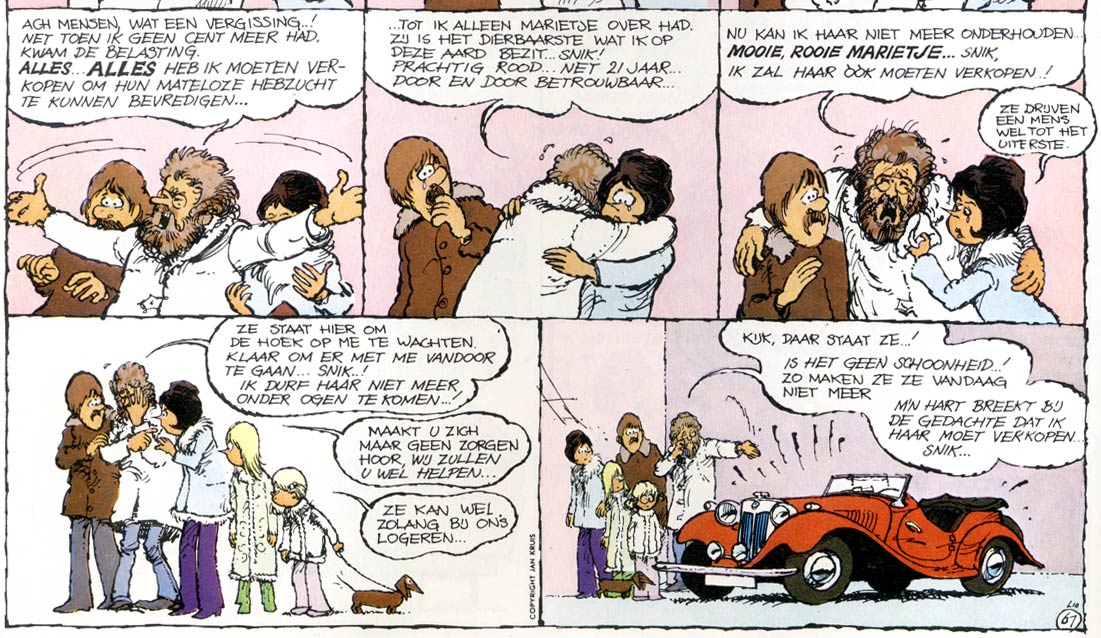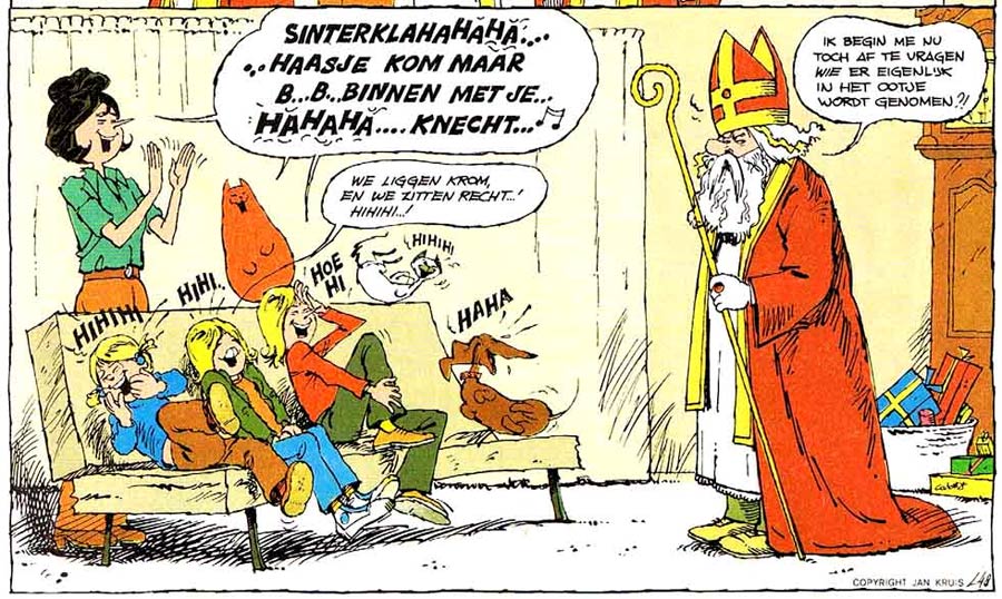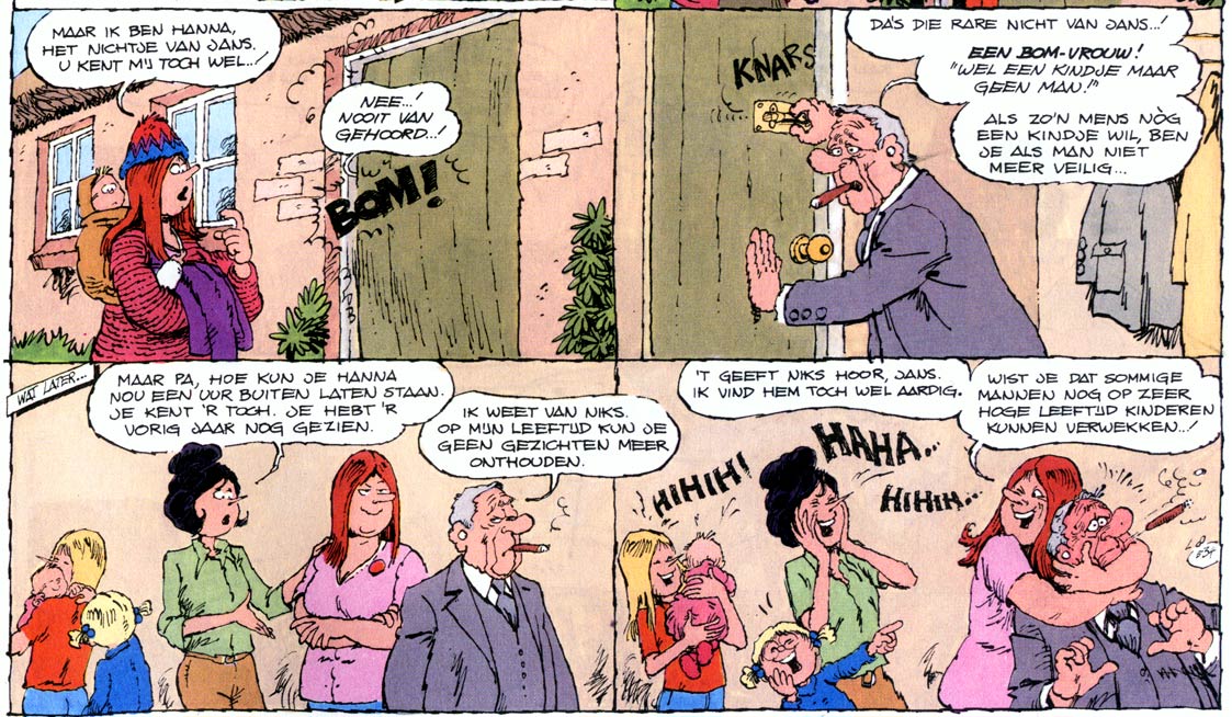 While the series' mainstream appeal can be credited to its non-offensive, slice-of-life style of comedy, 'Jan, Jans en de Kinderen' never shied away from addressing controversial topics. The Tromps don't live in a "safe" world. Real-life issues like racism, homosexuality, contraception and women's inequality have inspired narratives. Grandfather Tromp's old-fashioned opinions are often contrasted with Jan and Jans' more modern viewpoints. Occasional nudity and parental conversations about sex are recurring topics too. But Kruis always found a way to address controversial topics in a respectful, tasteful and still amusing manner. From this perspective, 'Jan, Jans en de Kinderen' became a mirror of Dutch society, particularly its reputation as a "tolerant, model nation". When Gerrit de Jager and Wim Stevenhagen launched their comic series 'De Familie Doorzon' in 1980, they deliberately wanted to provide a more cynical, satirical answer to 'Jan, Jans en de Kinderen', by centering on a dysfunctional family that isn't tolerant of eccentricities (though De Jager did stress that he respected Kruis' comic).