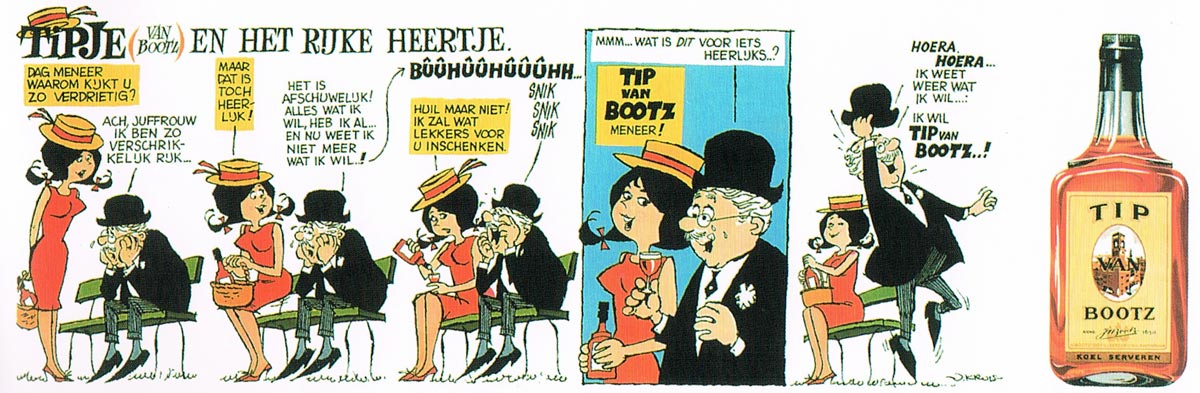 After their first collaborations in Olidin, the duo became responsible for a large number of 1960s advertising comics, which appeared in children's magazines like Donald Duck. Written by Kruis and drawn by Van der Voo, their creations included many strips for chocolate candy bars, for instance 'Max' for Mars, 'Tim' for Treets, 'Bounty Eiland' for Bounty and 'Mieke en Wouter' for Milky Way. Other strips were 'Koos' for Kodak photography, 'Sjokoprins' for De Beukelaer and 'De Broodversierders' for De Ruijter. With another co-worker, Martin Lodewijk, Jan Kruis created the 'Inspecteur Smulleman' strip (1966) for Treets confectionery. Still during the 1960s, Jan Kruis wrote and drew many advertising strips on his own, of which 'Tipje van Bootz' for Bootz brandy was probably the most prominent. Other advertisements in comics format were produced for Claeryn gin, Sloan's Liniment, Nieuwe Revu magazine and the advertising press.
