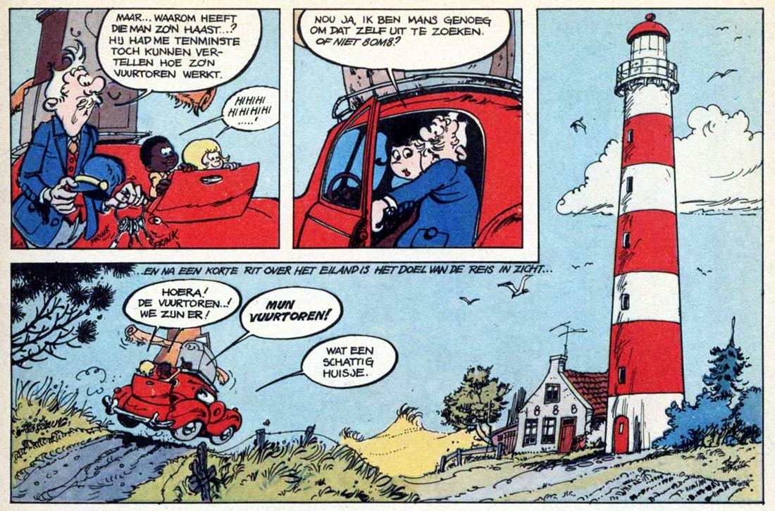 In his first 'Sjors en Sjimmie' adventure story, 'Het Raadsel van Schiermeeuwenoog' (1969), Kruis also changed the comic's setting to the fictional Wadden Island Schiermeeuwenoog. For the second story, 'De Ring van Schiermeeuwenoog' (1970), the artist received help on the script from Martin Lodewijk and the coloring from his wife Els. The future fine artist Leslie Gabriëlse assisted on the artwork. After only two 'Sjors en Sjimmie' stories, Kruis called it quits, as he didn't enjoy working on long adventure plots. He passed the pencil to Jan Steeman, who continued to create 'Sjors en Sjimmie' adventures in Kruis' designs and set-up in collaboration with a host of scriptwriters for another five years. In 1975, when Sjors magazine merged with Pep into Eppo magazine, Robert van der Kroft became the artist of another updated version of 'Sjors en Sjimmie'. Working with scriptwriters Patty Klein and then Jan van Die and Wilbert Plijnaar, Van der Kroft returned to the series' gag strip origins, dropping all of the adventure and fantasy elements.
