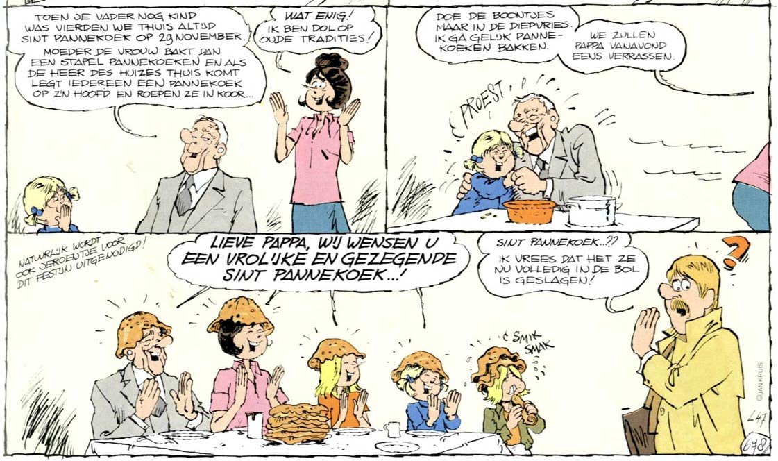 The 'Jan, Jans en de Kinderen' comic has also had an impact on Dutch pop culture. In a 1986 gag, Catootje doesn't want to eat beans, and prefers pancakes. Grandpa Tromp sides with her, claiming that it's "the 29th of November: Saint Pancake's Day" and that it is a tradition to put a pancake on your head and greet the breadwinner of the family when he enters the room. Jans believes the hoax and so Catootje can still eat pancakes for dinner. When the father arrives home, he is startled to see his relatives, each with a pancake on their heads, wishing him a "happy and blessed St. Pancake." Readers enjoyed the idea so much that in some Dutch communities it became an actual annual event on 29 November, particularly in Rotterdam and Groningen. In 2015, Kruis created 'Het Evangelie van Sint Pannenkoek', an illustrated text story in which he invented a backstory to the legend. On 17 August 2016, an official National Committee Sint Pannekoek was founded, for which Kruis designed a special postcard and stamp. The cartoonist's grandson Bas Deelman is chairman of Sint-Pannekoek Groningen.