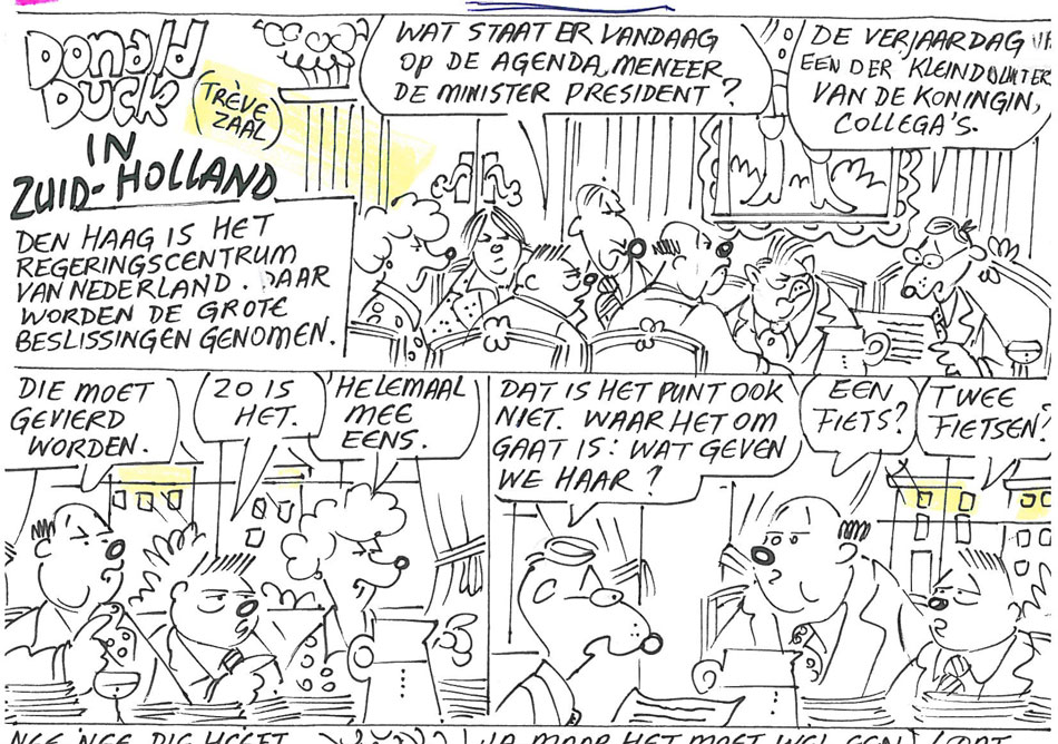Opening panels of Kruse's script for the special Donald Duck episode set in South Holland, featuring the Dutch prime minister (Donald Duck #17, 19 April 2012)