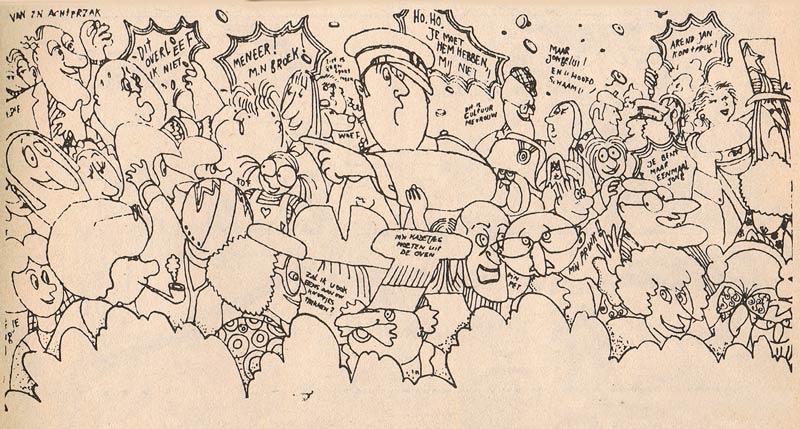 Eventually based in Deventer, Kruse has been working as a self-employed artist and actor, operating under the banner Jan Kruse Art & Act. During the 1970s, his illustrations appeared in the school magazines of publisher Malmberg (Okki, Taptoe), and for Misset Horeca, a specialized magazine of the Dutch Catering Association, he made the 1980s comic features 'De Uitbaters' and 'Kopstoot'. He also provided the illustrations for youth books like 'De Helden van de Edisonstraat' by Annette Colen (Omniboek, 1984). In addition, he has been active as a theatrical writer, director and performer, for instance with annual New Year's Eve cabaret performance in his hometwon of Deventer, in which he gave satirical commentary on the local news. Jan Kruse has also been an actor in advertising commercials, and appeared as supporting actor or extra in a variety of Dutch films and TV series, including 'Baantjer', 'Het Zonnetje in Huis', 'Kees de Jongen', 'Loenatik - The Movie', 'Goede Tijden Slechte Tijden' and 'HotNews.nl'.