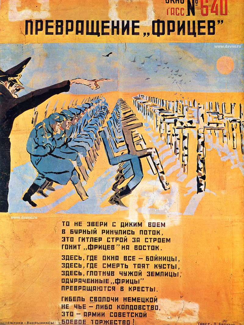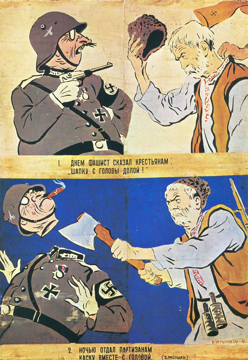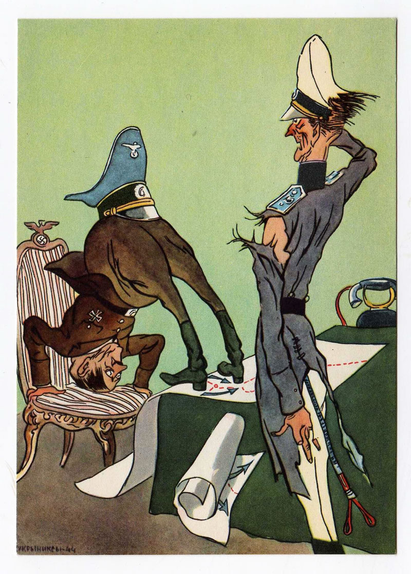 In 1938, Russia and Nazi Germany signed the Molotov-Ribbentrop Pact, which ensured that both countries would stay neutral in each other's affairs and wouldn't attack each other during a military conflict. However, in 1941 Hitler broke his promise and invaded Russia. Joseph Stalin was completely caught by surprise, as he was badly prepared for such an attack. However, the Russian army instantly fought back. The ROSTA news agency quickly established a special unit to produce motivational posters and propaganda cartoons. Kukryniksy were among many artists who supported their home country through anti-Nazi propaganda posters. The team's iconic poster 'We Will Crush and Destroy the Enemy Without Mercy' (1941) was one of the earliest to be mass distributed after Hitler invaded Russia. It depicts Hitler crushing through the Ribbentrop-Molotov pact, but a Red Army soldier points a bayonet to his face. Another famous poster by their hand is 'The Enemy Will Not Escape This Noose' (1942), which shows a severely bruised Hitler in a stranglehold by strong U.S., British and Russian hands. 'Transformation of Fritzes' (1942) also gained fame: it shows Hitler ordering troops to invade Russia, but they freeze into swastikas and eventually graveyard crosses. Another often reproduced poster is 'A Reception Given by the Possessed Commander-in-Chief' (1944). It shows a military officer greeting Hitler, who is standing on his head, while his military hat rests on his behind. The Führer is literally talking from his ass, but it makes no difference to his subordinates.