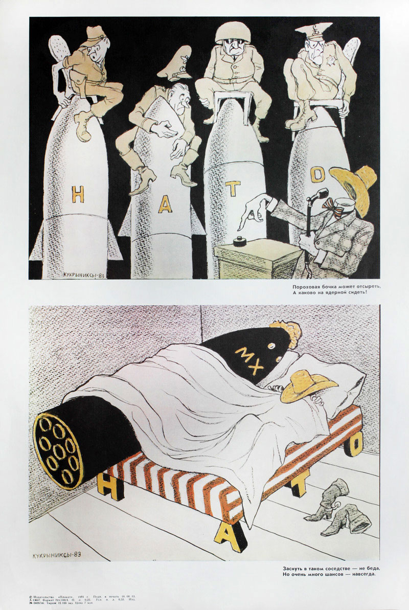In 1945, Kukryniksy were hired as courtroom sketch artists during the Nuremberg trials. While their war cartoons have become the most iconic and often-reproduced in history books, the team kept making other propaganda cartoons during the Cold War. Some of them made use of sequential narrative images.