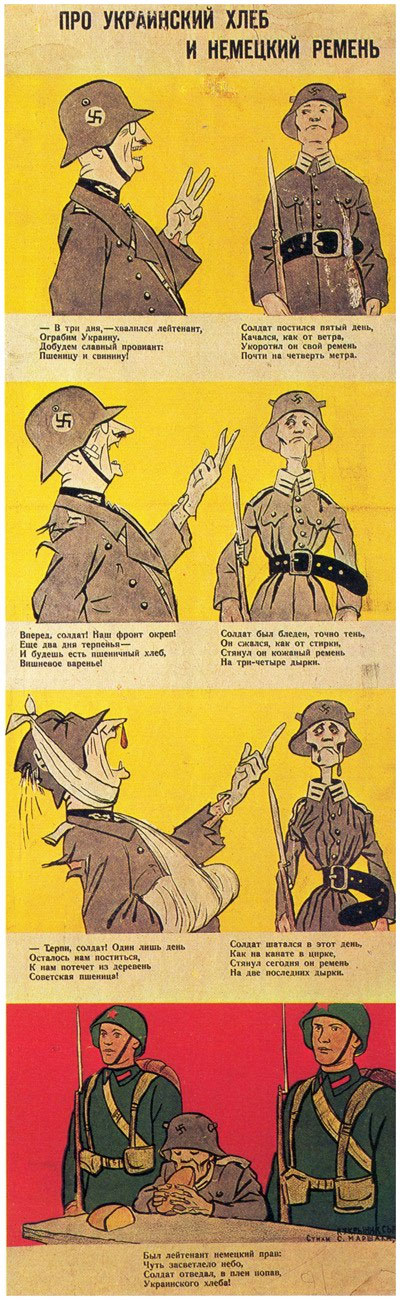 Three posters with sequential images from 1941 all revolve around food. In 'An Anthropophagus-Vegetarian' (1941), Hitler's vegetarianism is mocked. We see him passionately protecting the life of a sheep in the first panel, but having no problem massacring people in the second. The badly nurtured German army is ridiculed in 'The Bait' (1941), where Russian soldiers are able to ambush Nazis by just releasing a group of barnyard animals in front of them. When they try to catch and eat them, they are all shot dead. In 'About Ukrainian Bread and German Belt' (1941) a Nazi officer (presumably Heinrich Himmler) promises a soldier food and victory, though his subordinate is so starved that he surrenders to the Russians in the final panel and is given bread to feast on. Hitler and his cronies are licking their lips in 'Doughnuts and Bruises' (1943), where they glare at doughnuts which represent the locations Caucasus, Africa, Transylvania, the Kuban and Moscow. But in the second panel they are all left with bruises from their failed attempt to devour them.