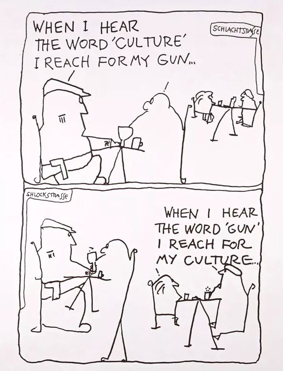 Kupferberg strip from 1960, poking fun at Nazi playwright Hanns Johst's famous quote: 'When I hear the word "culture", ... I release the safety on my Browning!", which is often misquoted as: "When I hear the word "culture", ... I reach for my gun!" and misattributed to Nazi leaders Hermann Göring, Heinrich Himmler or Joseph Goebbels.