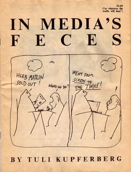 Kupferberg published three large cartoon books during his lifetime, 'Questionable Cartoons' (Vanity Press, 1981), 'In Media's Feces' (Strolling Dog Press, 1986) and 'Teach Yourself Fucking' (Autonomedia, 2000). According to his wife Thelma, Kupferberg didn't always sign his cartoons, because some were so radical that he could be held responsible for them. But since he didn't want to be paid for them, it didn't matter anyway.