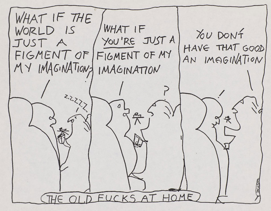 Some cartoons and comics by Kupferberg revolve around sex. In one, a man asks a woman: "Do you want to have a child?", when she replies "No.", he answers: "Do you want to practice?". In another, a man brags that he "slept with 100 women", only to add: "Only fucked two of 'em, tho'". Kupferberg's cartoons have no real recurring characters, though some have the title 'The Old Fucks at Home' and depict an elderly couple sitting in front of the television, commenting on the news.