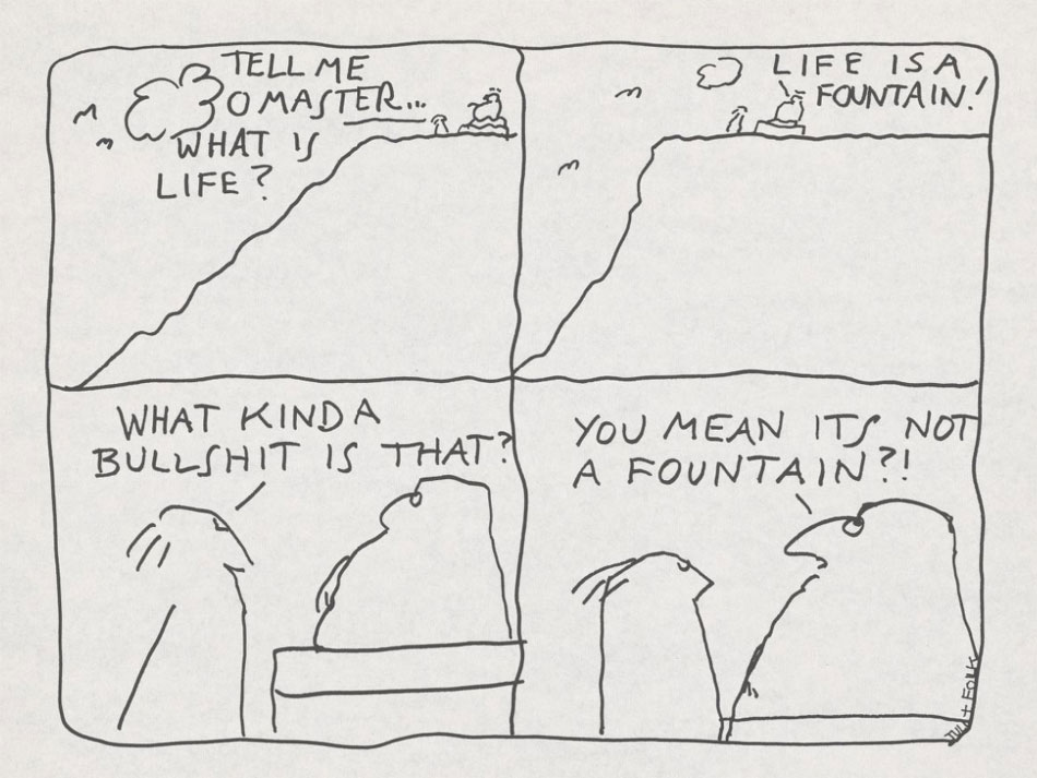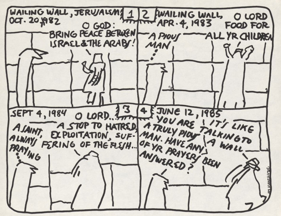 Many cartoons were directly inspired by then-current events. The Israeli-Palestinian conflict is referenced in a 1985 cartoon in which a Jewish man prays in front of the Wailing Wall that peace will come, only to have the years just pass. When an observer praises his piousness and asks him if any of his prayers have been answered, the other replies: "It's like talking to a wall." Sometimes Kupferberg directly added a photocopied newspaper article to give context. When Steven Spielberg won seven Oscars for his Holocaust drama 'Schindler's List', a newspaper headline read: "Spielberg sobs after winning Oscar awards: this is for the 6 million who died". This rather awkwardly phrased headline inspired Kupferberg to add the wry commentary: 'Great moments in the history of journalism: Hooray for Hollywood: "I went to the gas chambers and all I got was this lousy Oscar."'