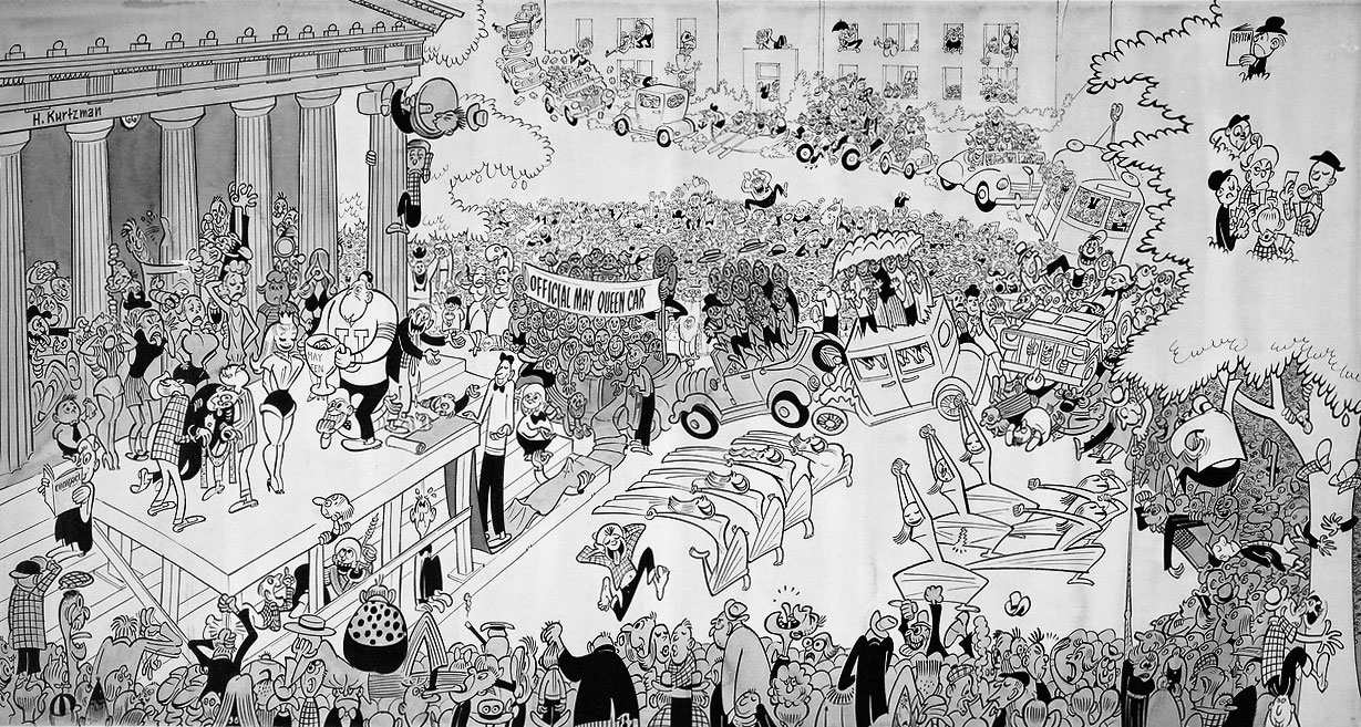 Harvey Kurtzman was born in 1924 in Brooklyn as the son of Russian-Ukrainian Jewish parents, although his father had converted to Christian Science. When Harvey was four, his father refused to treat a bleeding ulcer and just prayed to be cured, as his church taught him. After his subsequent death, Harvey's mother placed her children in an orphanage for three months, until she found a job as a hatmaker. She remarried to a brass engraver who was active in trade unions, and who also encouraged Harvey Kurtzman to pursue his artistic interests. On Monday mornings, the boy went through people's garbage cans to search thrown-away copies of yesterday's papers, just to collect the Sunday funnies. He drew his own comics in chalk on the pavements of the Brooklyn streets, and named his characters 'Ikey and Mikey' after Rube Goldberg's 'Mike and Ike'. Besides Goldberg, Kurtzman's graphic influences were Will Eisner, Milton Caniff, Chester Gould, Harold Foster, E.C. Segar, Alex Raymond, Al Capp, Thomas Nast, Wilhelm Busch, Caran d'Ache, H.M. Bateman, Bill Holman and V.T. Hamlin. His love for parody and satire was mostly shaped by Eisner's 'The Spirit' and Capp's 'Li'l Abner'. The anarchic comedy of The Marx Brothers and self-reflexive cartoons of Tex Avery and Looney Tunes influenced him as well. Kurtzman also studied the engravings of Gustave Doré, particularly his use of light and shading. In terms of magazines, he enjoyed reading Yale Record, The Harvard Lampoon, Judge and Punch.