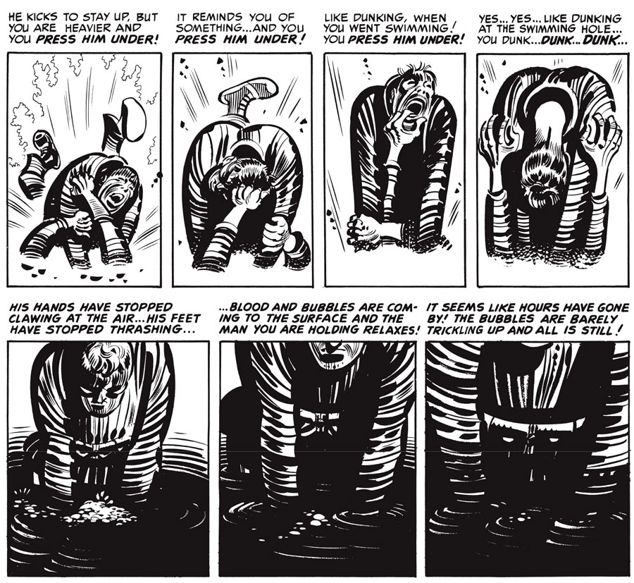 Kurtzman knew from first-hand experience that real-life combat had nothing to do with Hollywood or infantile comic books. He went through great lengths to research his stories, interviewing soldiers, flying along in a rescue plane and even ordering his assistant Jerry DeFuccio to travel inside a submarine. Kurtzman illustrated a few stories in the series himself, such as the Two-Fisted Tales stories 'Conquest' (issue #18, November-December 1950), 'Jivaro Death' (issue #19, January-February 1951), 'Pirate Gold' (issue #20, March-April 1951), 'Search' (issue #21, May-June 1951), 'Kill' (issue #23, September-October 1951), 'Rubble' (issue #24, November-December 1951) and 'Corpse On the Imjin' (issue #25, January-February 1952). For Frontline Combat he drew 'Contact!' (issue #2, September-October 1951), 'Prisoner of War!' (issue #3, November-December 1951), 'Air Burst!' (issue #4, January-February 1952) and 'Big 'If'!' (issue #5, March-April 1952). For most of the others, he wrote the narratives and sketched the storyboards, while the finished artwork was provided by the regular EC artists Dave Berg, Gene Colan, Johnny Craig, Reed Crandall, Jack Davis, Will Elder, Ric Estrada, George Evans, Russ Heath, Bernard Krigstein, Joe Kubert, John Severin, Alex Toth and Wallace Wood. On occasion, Jack Davis, Colin Dawkins, Jerry DeFuccio, George Evans, John Putnam and Wallace Wood helped out too.
