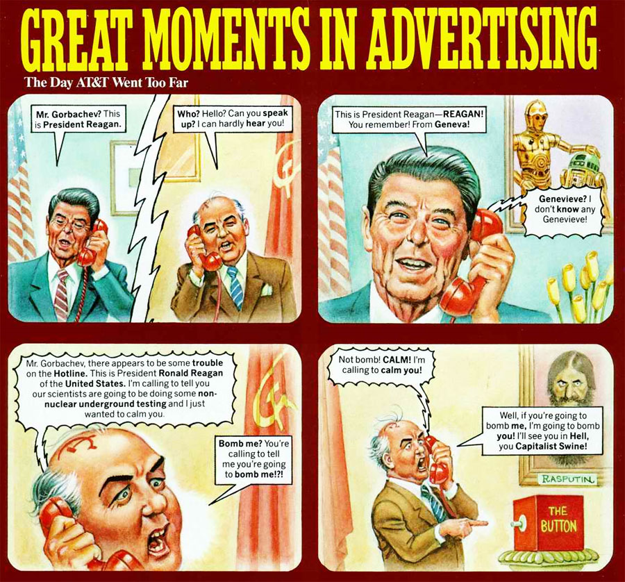 'Great Moments In Advertising - The Day AT&T Went Too Far' (Mad #263, June 1986), artwork by Kurtzman & Will Elder, satirizing TV commercials for AT&T  telephone services and U.S. president Ronald Reagan and Soviet leader Mikhail Gorbachev.