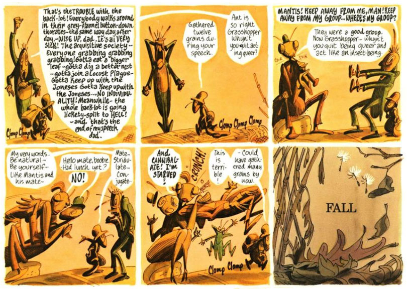 In 1960, Kurtzman created two parodies of classic children's stories. 'Pinocchio Retold' appeared in February 1960 in Pageant, while 'The Grasshopper and the Ant' was published in May of that same year in Esquire magazine. Both comics reimagine the characters as beatniks who question society, with Kurtzman parodying the typical language of their subculture. With 'Grasshopper', he got the opportunity to publish in color and took full advantage of it to represent the changing of the seasons. His attempt at creating a gag-a-day comic with Elliott Caplin, 'Kermit the Hermit', failed to find a publisher. To survive, Kurtzman wrote freelance articles for Esquire, Madison Avenue, Pageant, Playboy, the Saturday Evening Post and TV Guide.